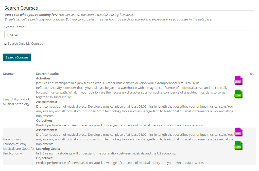This ever-expanding, fully searchable, moderated database only includes syllabi (made public by instructors) that have a learning-focus as described by our Syllabus Rubric. Once you've successfully completed c3Design, you will be able to search for courses designed by other instructors and import their designs directly into your work space rather than having to start from scratch.