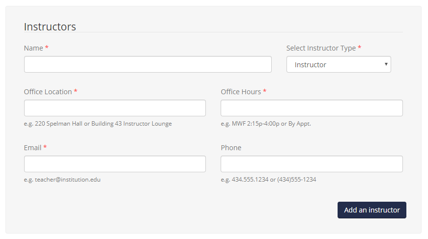 While you move through c3Design, we will collect various pieces of information from you to add to your syllabus, including your course and instructor information, learning goals and objectives, course description, and assignments and activities. The example below is part of the form that collects instructor information.